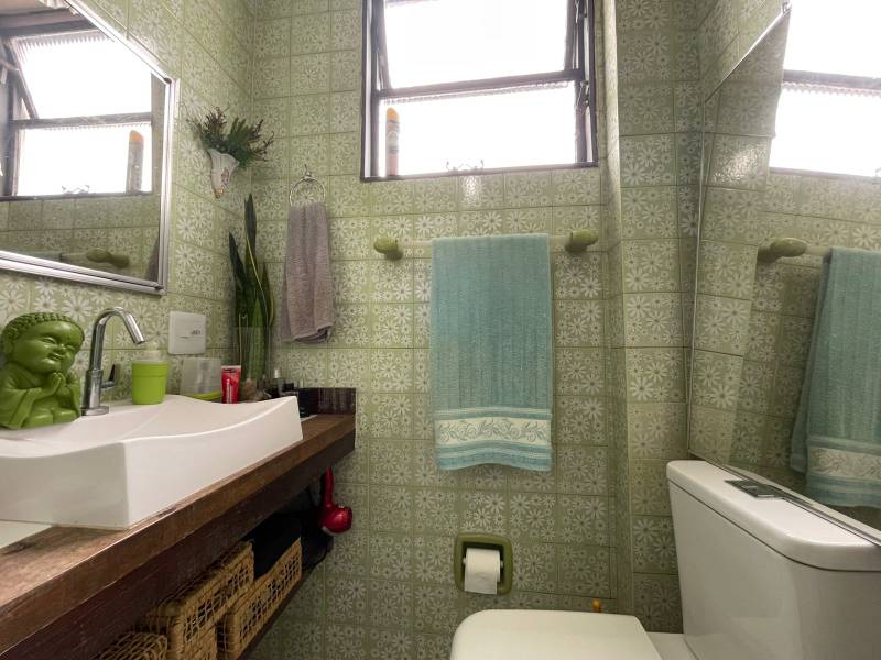 Banheiro social com piso em porcelanato, bancada em madeira, cuba em louça e box em blindex.