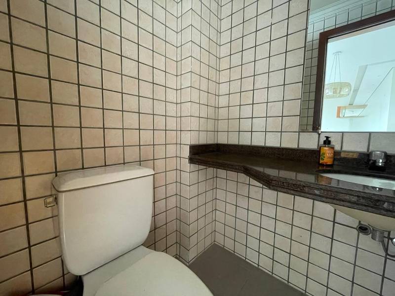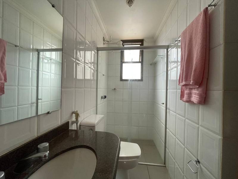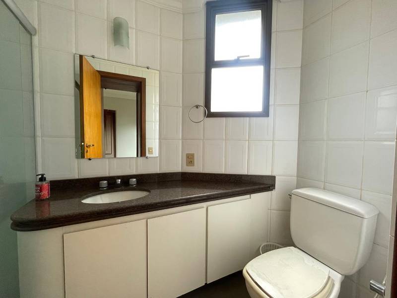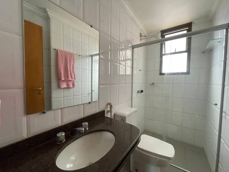 Banheiros (social e suíte) com piso em cerâmica, bancadas em granito e box blindex.