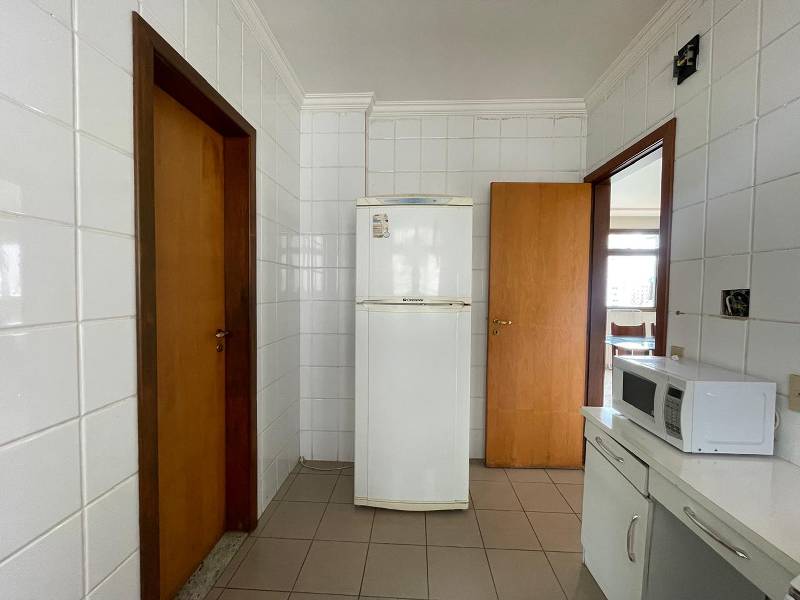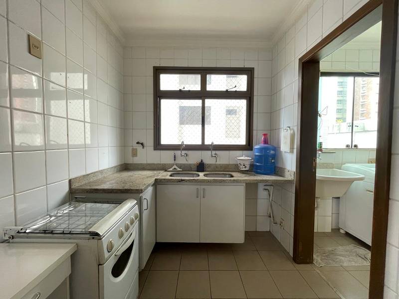 Cozinha ampla e arejada, com armários, piso em cerâmica, armários sob bancadas em mármore.