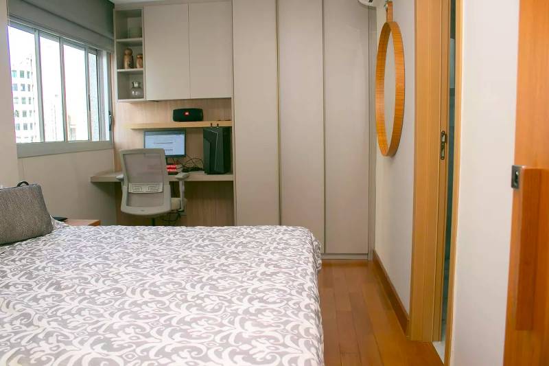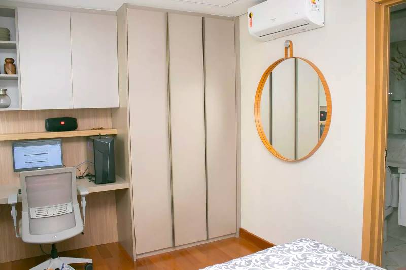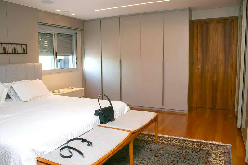1 Quarto amplo com piso em tábua corrida, teto rebaixado e iluminação planejada, sendo a suíte com closet, escritório, rouparia, marcenaria da Cinex, janelas com persianas automatizadas e box em blindex.
