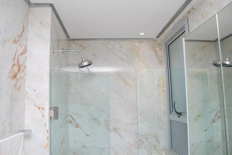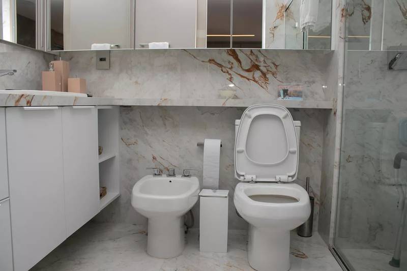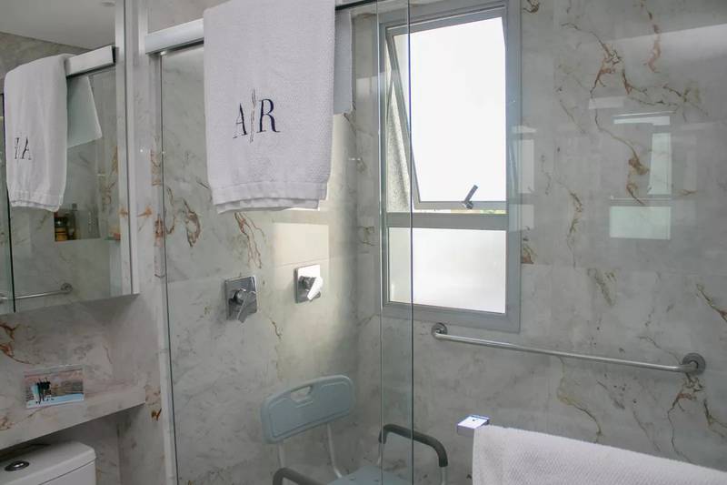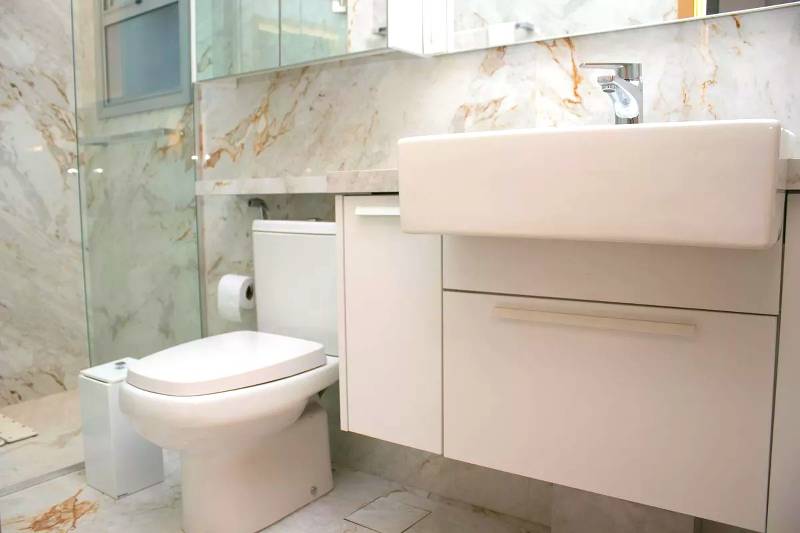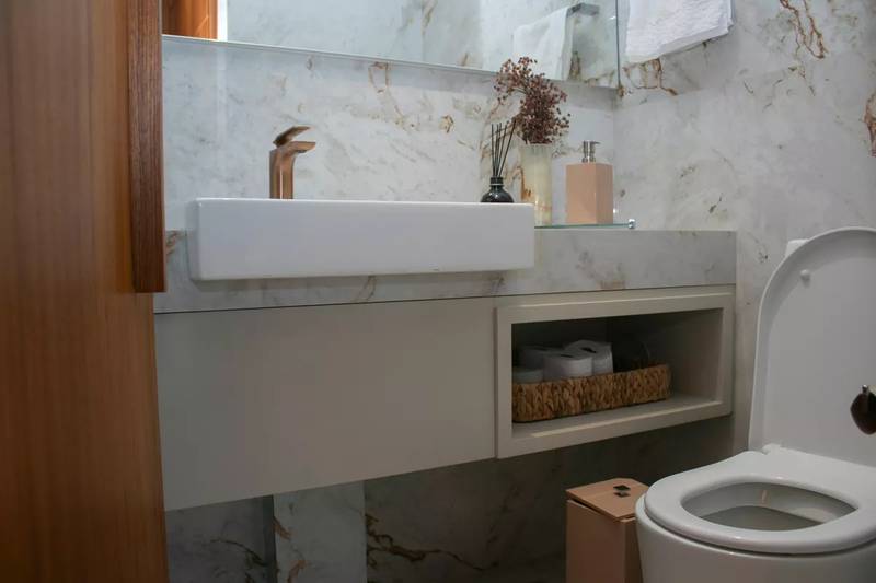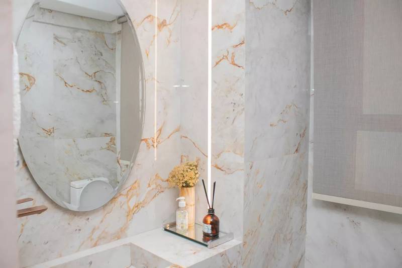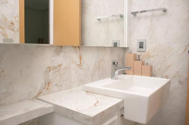 Lavabo com espelho, bancada e piso em porcelanato italiano