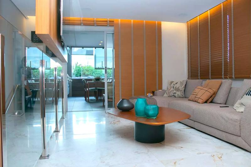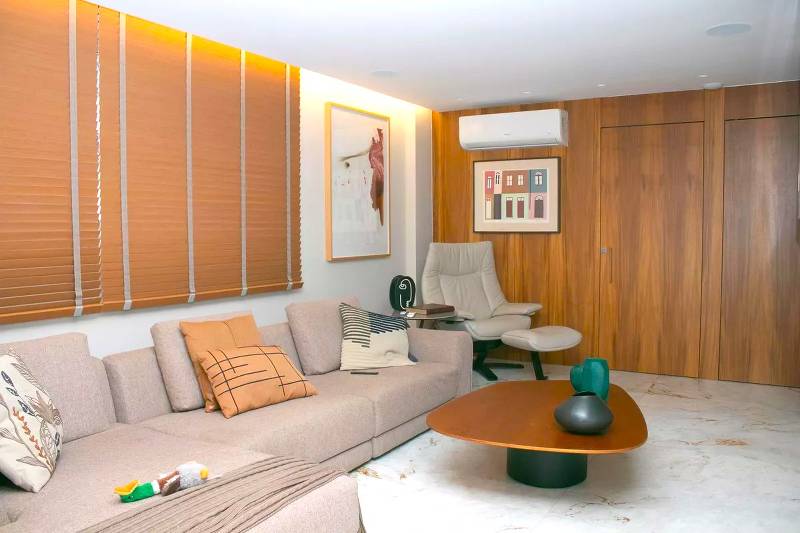 1 Sala de estar com piso em porcelanato italiano.