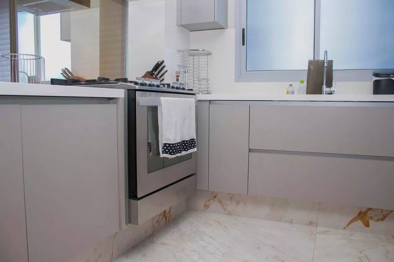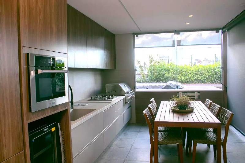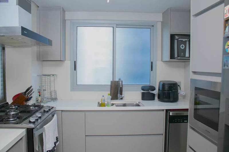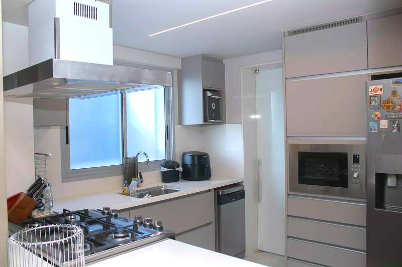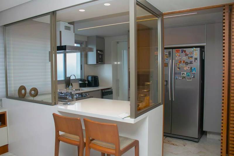 Cozinha ampla com bancada americana, passa-prato e marcenaria da Cinex, persianas automatizadas e piso em porcelanato italiano.