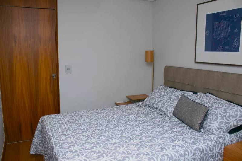 1 Quarto amplo com piso em tábua corrida e armários, sendo a suíte com piso em porcelanato italiano, bancada em granito, espelho e box em blindex.