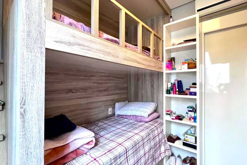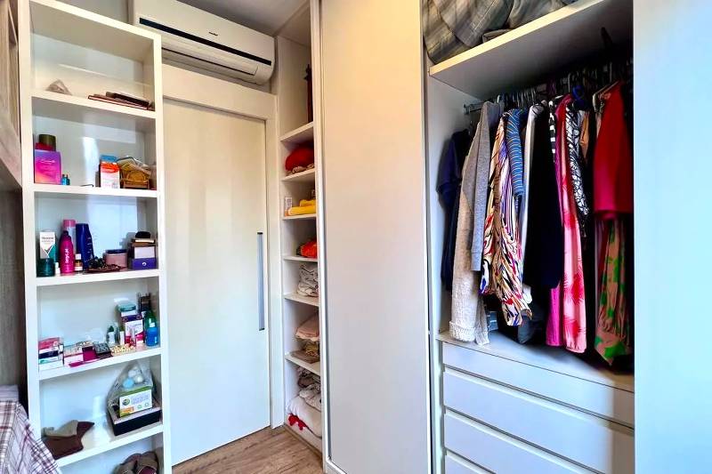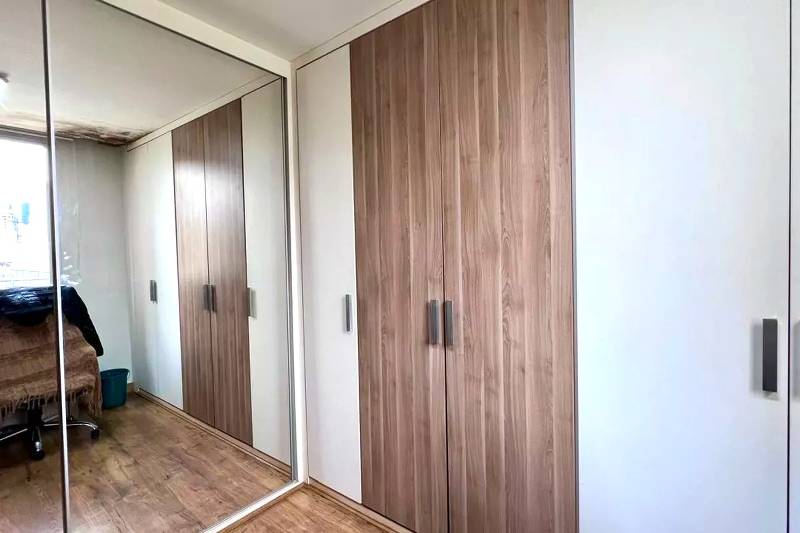 3 Quartos amplos com piso vinílico amadeirado e armários, sendo uma suíte com bancada em granito, armários, espelho e box em blindex.