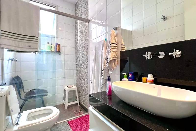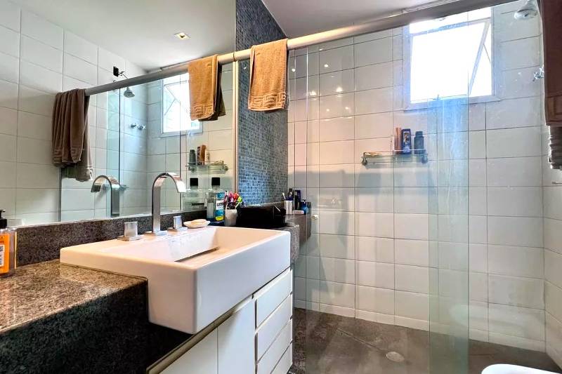 Banheiro social com bancada em granito, armários, espelho e box em blindex.