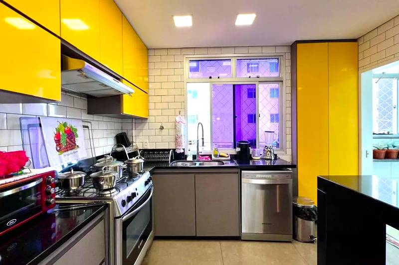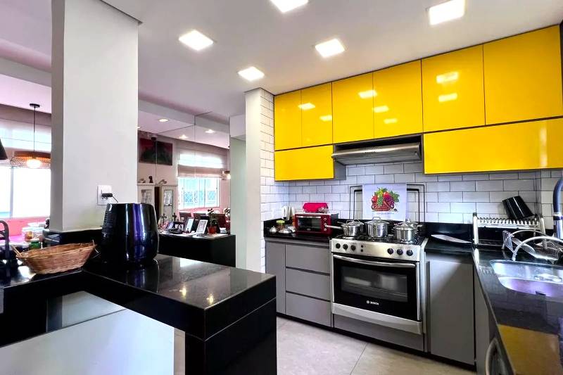 Cozinha ampla com piso em porcelanato, iluminação planejada, bancada americana em granito preto e armários planejados.
