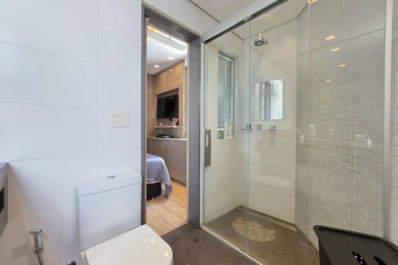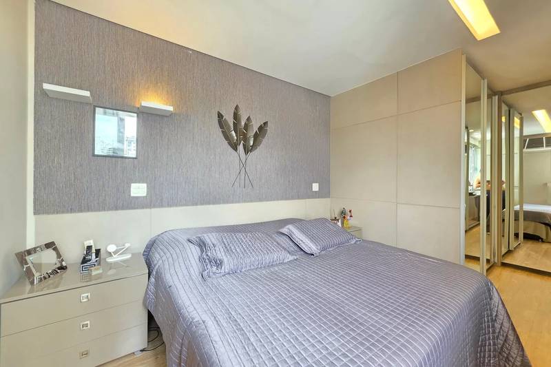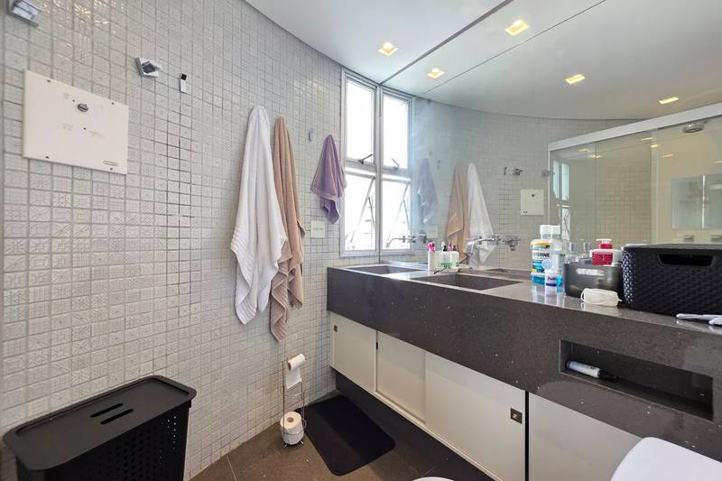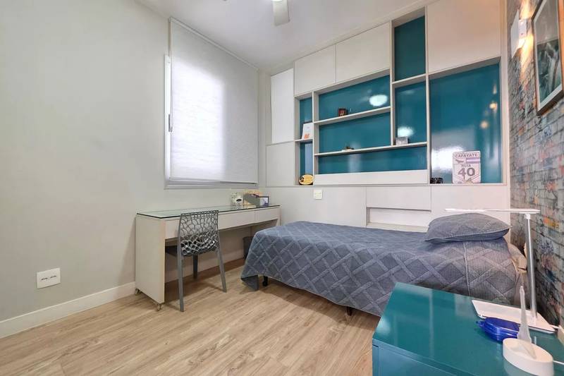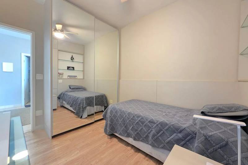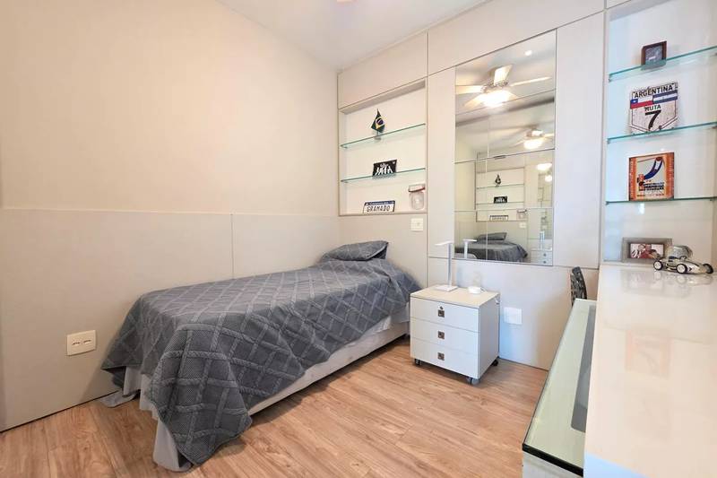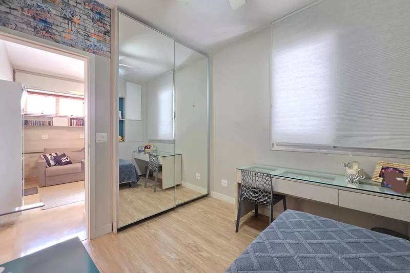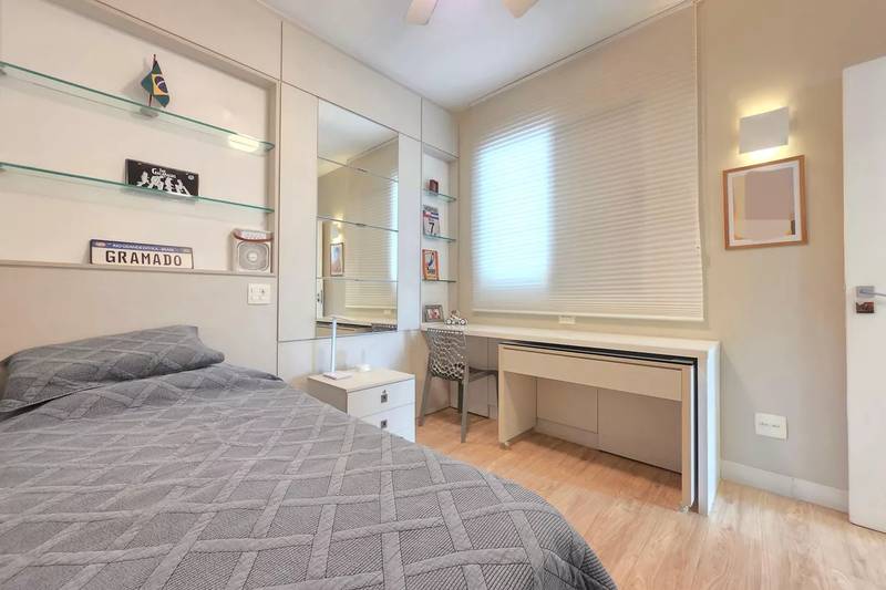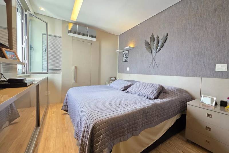 4 quartos amplos, todos com armários, piso vinílico amadeirado, teto rebaixado e iluminação planejada, sendo uma suíte com bancada em granito, espelho e box em blindex