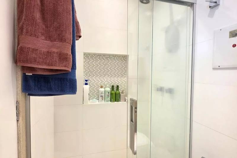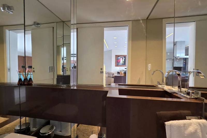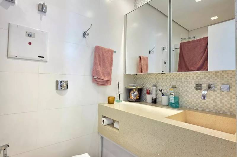 Banheiro social com espelho, bancada em granito, armários e box em blindex