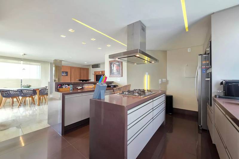 Cozinha espaçosa, possuindo uma ilha central com bancada ampla e cooktop de cinco bocas embutido, além de coifa em inox suspensa, iluminação e armários todos planejados