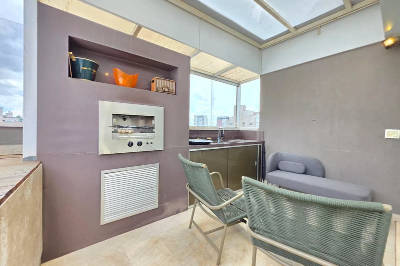 Área privativa ampla, completa, com churrasqueira, hidromassagem elevada, bancada em granito e armários planejados